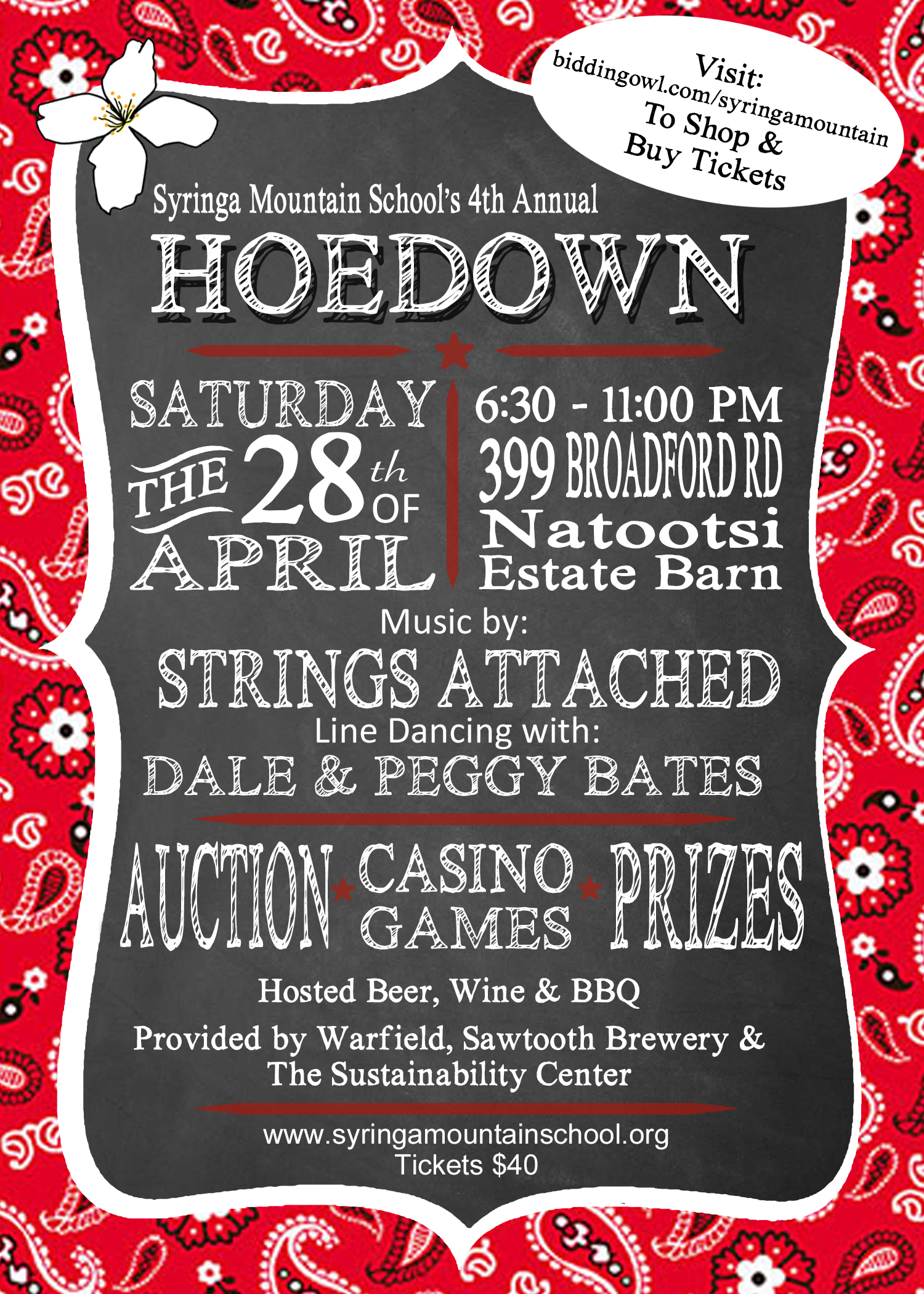 Tickets for the hoedown will be on sale for $40 April 1st and include a traditional bbq spread with locally sourced foods created by Al McCord of the Sustainability Center and includes wine or a variety of delicious beers from Warfield and Sawtooth Breweries.  Purchase tickets ahead of time at biddingowl.com/syringamountain or at the door.  Else look for the Hoedown pop up locations at local grocery stores throughout the month of April.